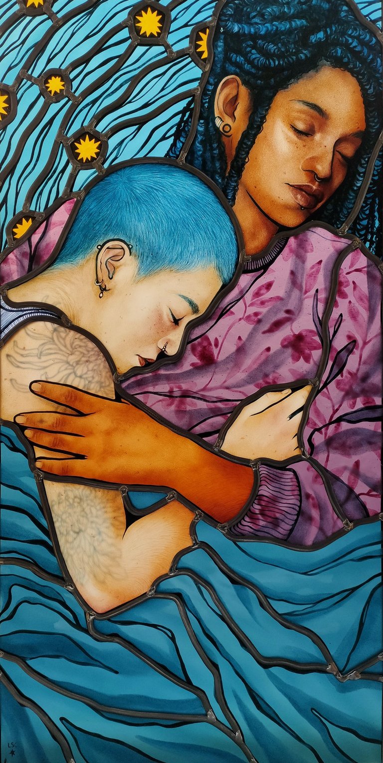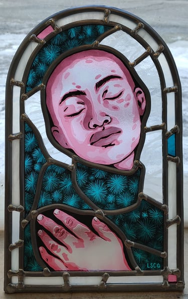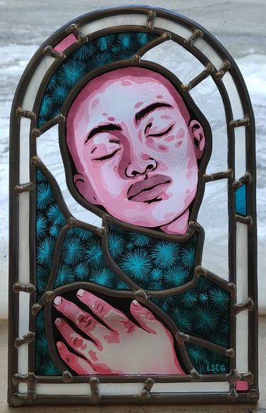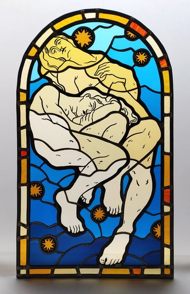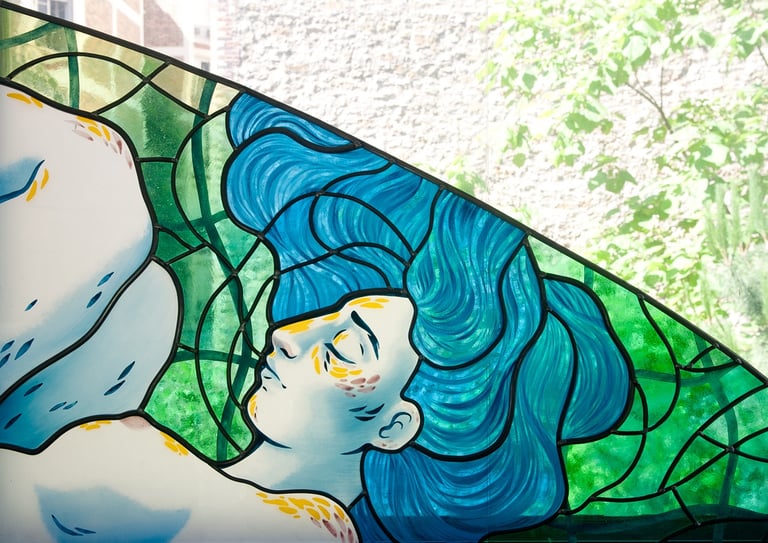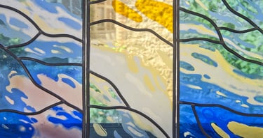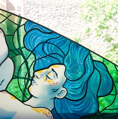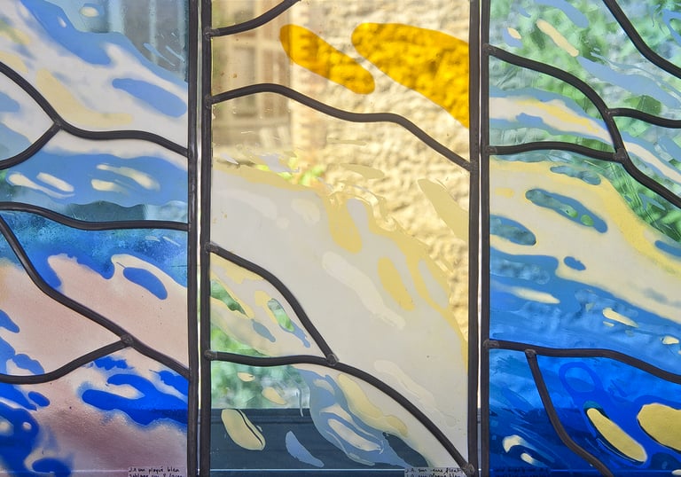 Panneaux d'échantillon, projet fictif d'un ensemble de vitraux créés pour une piscine