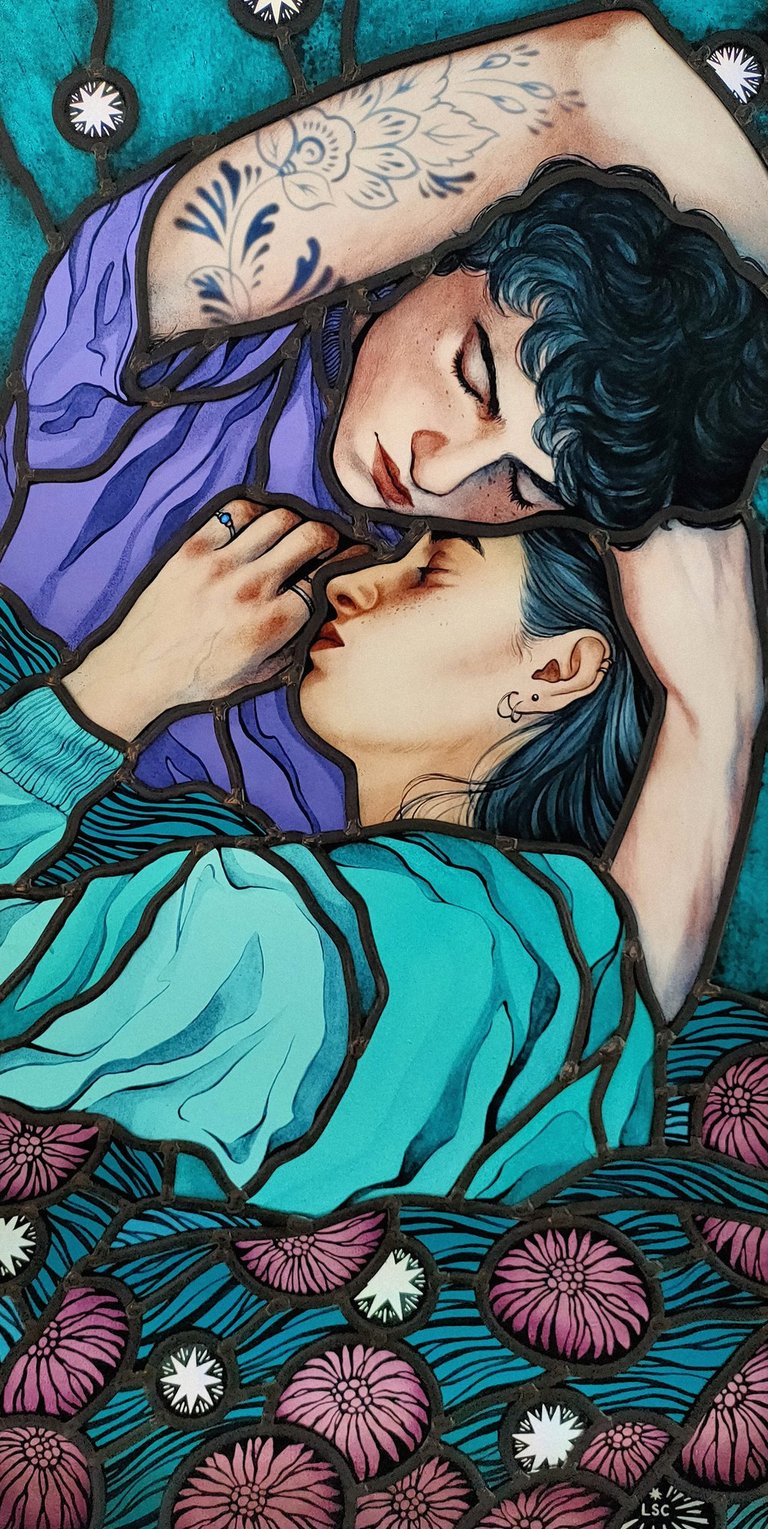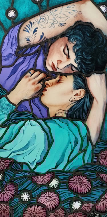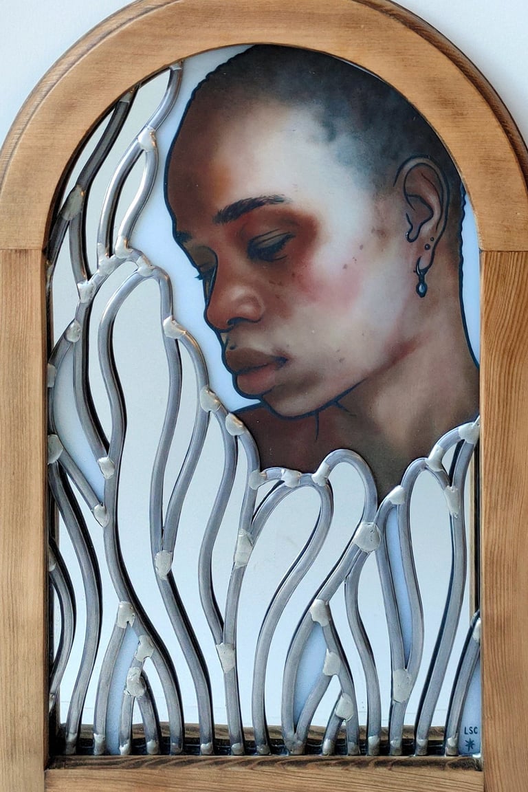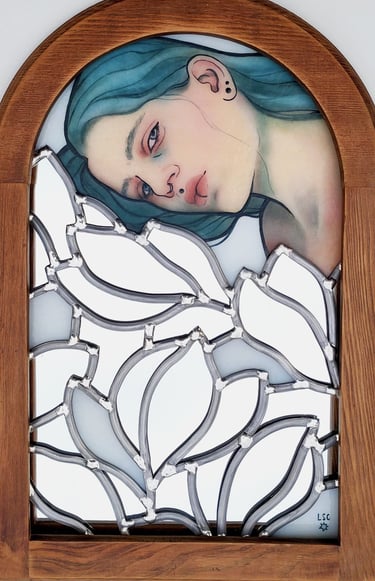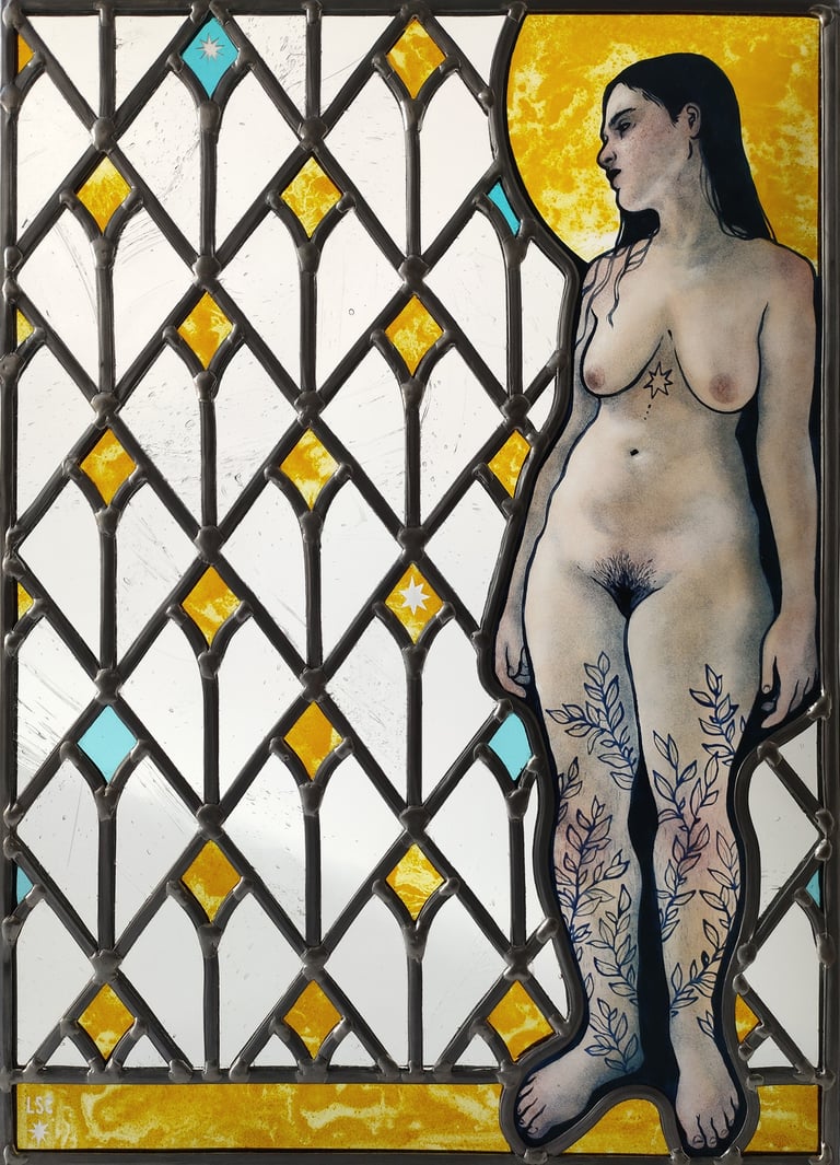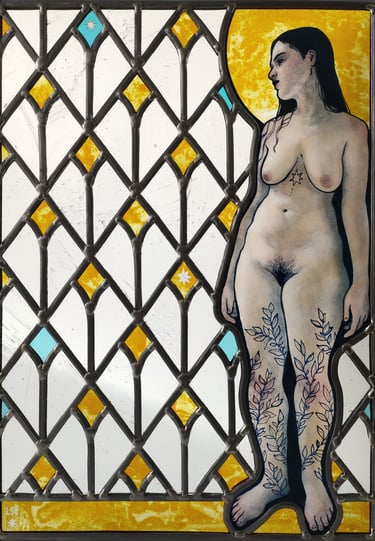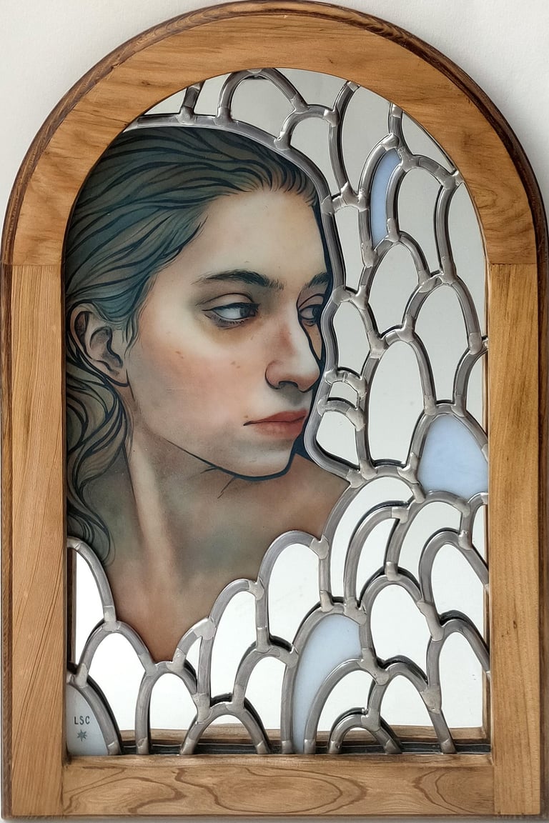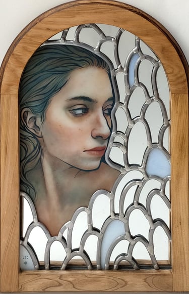 30x20cm, Grisailles sur verre opaque, miroir, montage au plomb, cadres en bois chinés